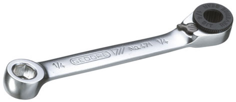 985In acciaio CROMO-VANADIO.$Tipo a doppia testa con attacco esagonale femmina da 1/4" fisso da una parte e a cricchetto con levetta per movimento D+S dall´altra. Esecuzione cromata. Dentatura finissima.$Lunghezza totale mm 90.