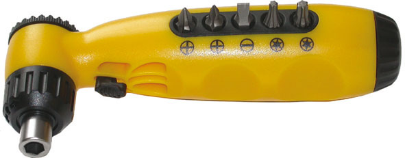 984GZTTipo angolare in robusto materiale sintetico. Leva a cricco, attacco magnetico esagonale femmina per bits, con ghiera per movimento D + S e disco supplementare per avvicinamento rapido.$Lunghezza totale mm 145.$Completo dei seguenti inserti posti nell´impugnatura:$1 bit a doppio taglio mm 4,5/6$2 bits a doppia croce PH Gr. 0/3 - 1/2$2 bits a doppia impronta TORX da T 10 /15 - 20/25.