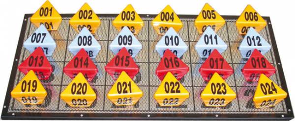 997ZSerie di 24 triangoli apribili, numerati, colorati, in plastica indeformabile provvisti di magnete permanente per la rapida identificazione delle vetture in riparazione o qualsiasi altro oggetto da individuare facilmente.$Forniti di pannello in lamiera forata da applicare a parete, dimensioni mm 1000x500, con numerazione per rimettere i triangoli al giusto posto dopo l´uso e 24 ganci per appendere le eventuali chiavi.